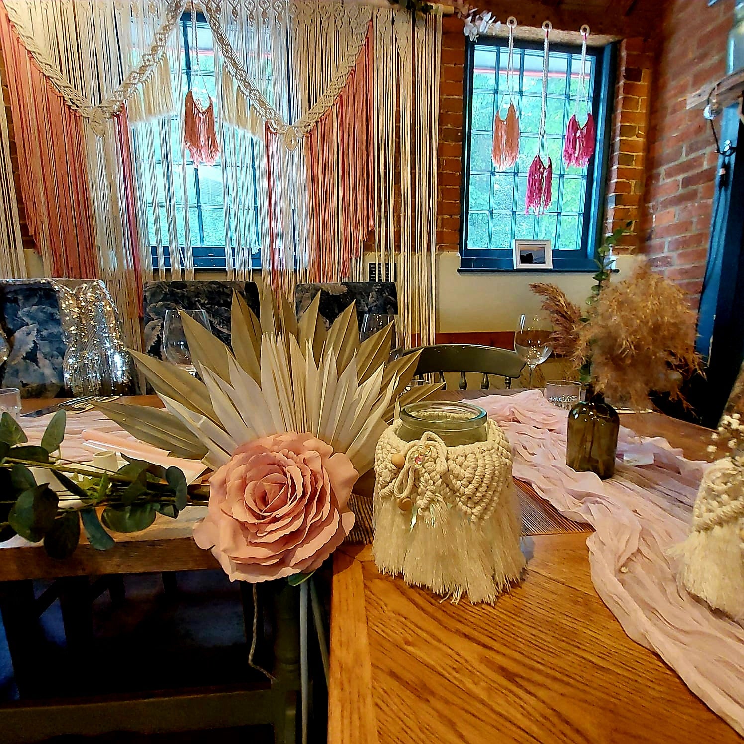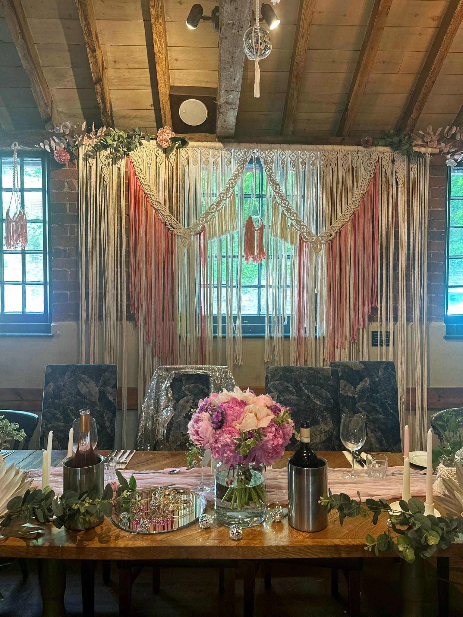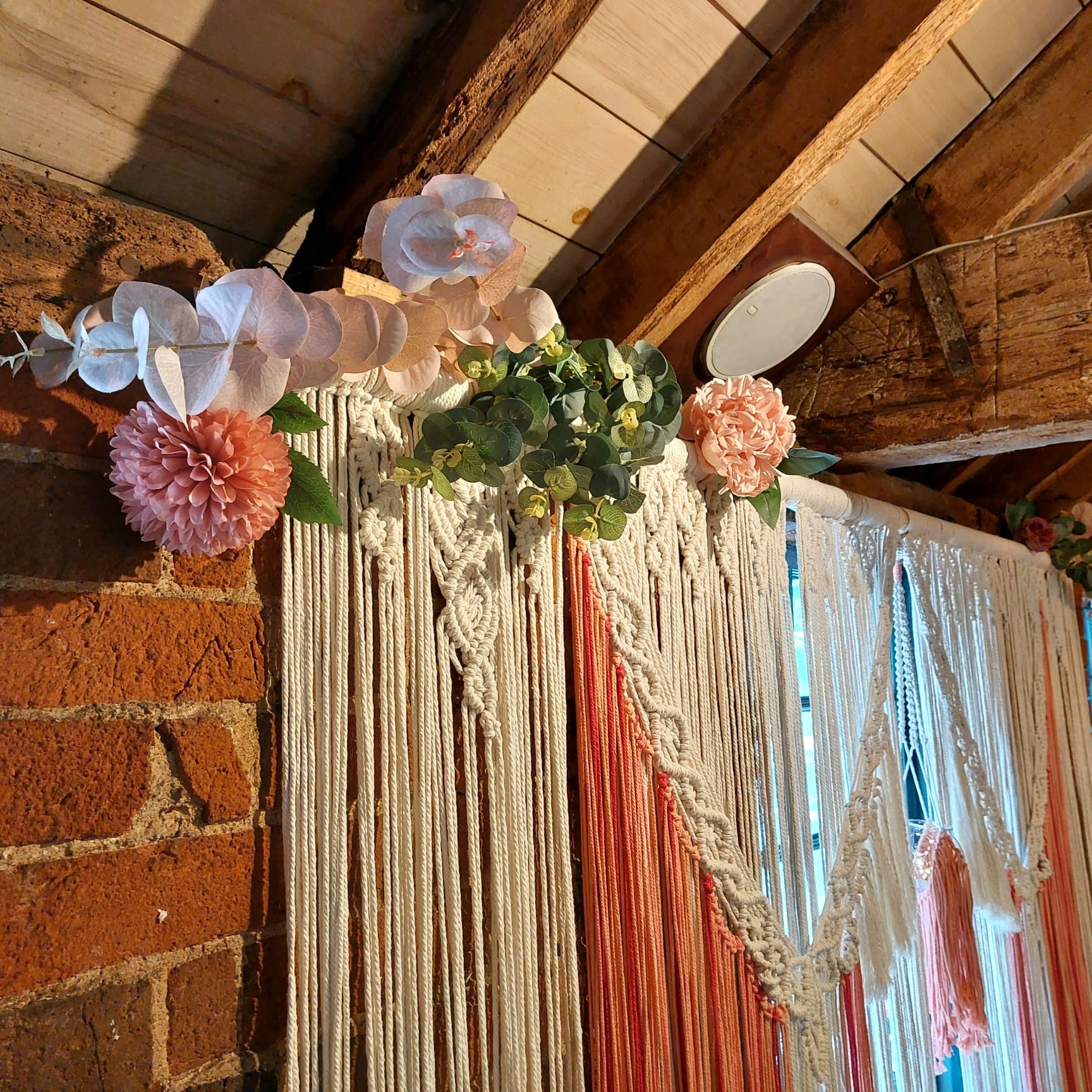 Macramé boho wedding and event décor can offer a unique, enchanting ambiance that blends elegance with a touch of whimsical charm. Whether it's a wedding, a corporate gathering, or a special milestone celebration, macramé pieces can be tailored to suit the specific aesthetic of the venue, adding a personalized touch that reflects the individuality of the occasion. From stunning backdrops and table runners to delicate chair hangings and dreamcatchers, each piece can be woven with chosen colors that harmonize with the event's overall design. Beyond the celebration, these macramé backdrops can be transformed into cherished keepsakes for your home, as a beautiful reminder of your special day. Book your free consultation call with me, where we can brainstorm ideas, designs and help put together a personalised package for you.